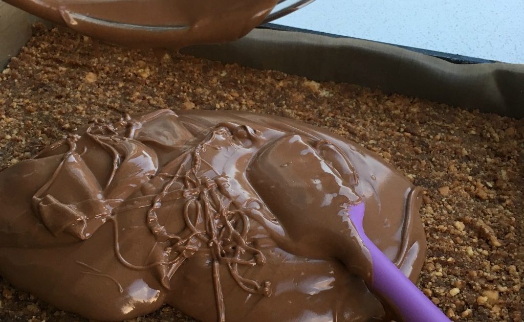 - When combined, finely crush the digestive biscuits and add to melted mixture in the saucepan.